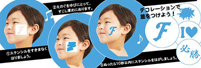 水も筆も使わずに、指で塗ることができるフェイス・ボディペイント専用絵具「MIRACLE PAINT(ミラクルペイント)」。もうひとつの特徴はわずか5分で乾いて指でつまんで簡単にはがせること!!また、皮膚科の先生と共同開発した安心の日本製です。 ステンシルステッカーは全11種で、内2種はオリジナルデザイン!!