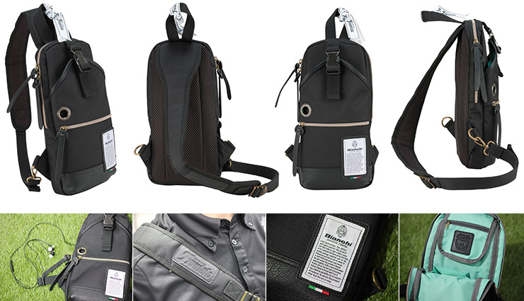 ボディバッグは「Bianchi」アパレルラインで最も人気のある商材。ブランドのイメージカラーはイタリア語で碧空・天空の意味である“チェレステ”。※当商品では、このブランドカラーを内生地に使用しています。
