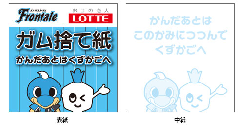 | 内容 | 明治安田生命J1リーグホームゲーム時に実施している「ロッテ ガムステーション」でロッテキシリトールガムをお渡しする際に、噛み終わったガムを捨てる時に便利なオリジナルガム捨て紙をお一人様お一つお渡しいたします。噛んだ後はこのガム捨て紙に包んでくずかごへ。マナー向上でスタジアムをよりきれいにしましょう!
