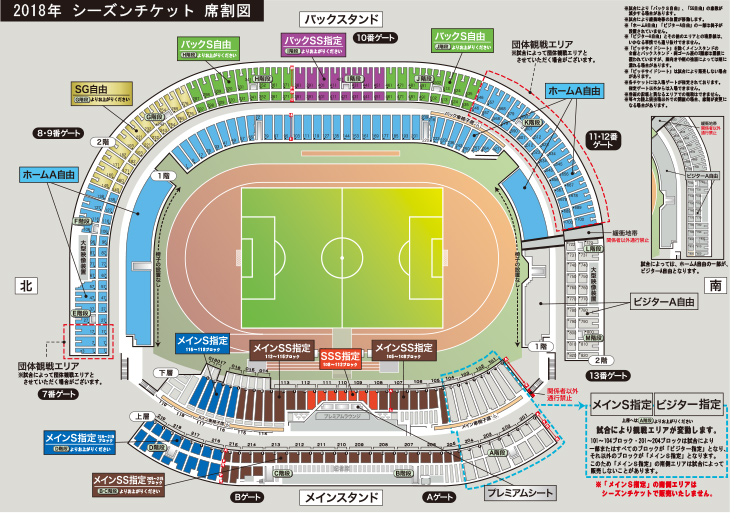 ※メインS指定の南側エリア(図中の青点線による囲み部分)は試合により販売しない場合があるため、シーズンチケットとしての販売は行いません。