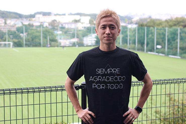 Tシャツのモチーフとしては僕が人生で最も大切にしている"全てのことに感謝の気持ちを忘れない"という言葉をスペイン語で書き、それに加えてサッカーで大切な"心技体"と三角形で表現しました。自分のサッカー人生を表した作りになっています。