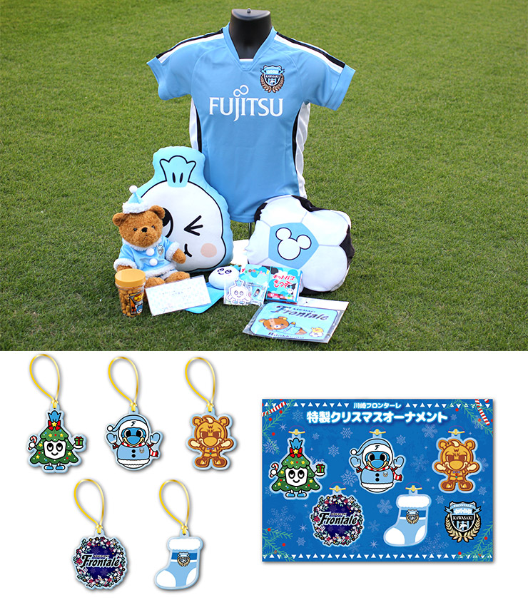 ホームゲームで選手たちと一緒にピッチへ入場する「ウィズハンド入場行進」、「フラッグ掲揚」の参加者が着用するキッズ用ユニフォームを中心に、特製クリスマスベアを含むフロンターレグッズがたくさん詰まったクリスマスパックを販売します!