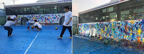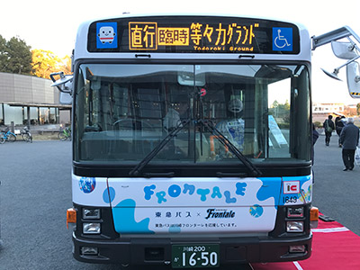| デザイン概要 | 等々力陸上競技場に足を運んでくれるサポーターと一緒に作るラッピングバスとして、東急フェスタのイベントの中で実際に東急バスの車両を染めるイベントを行いました。