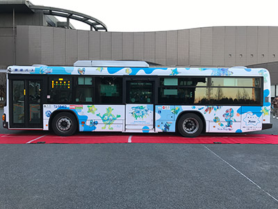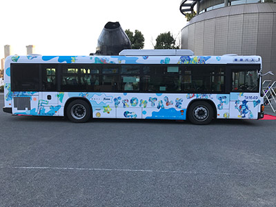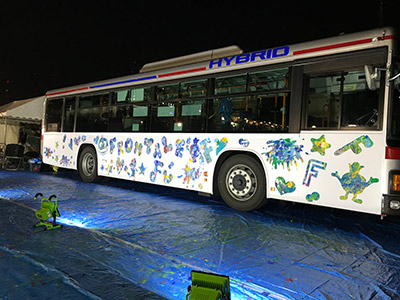 上記で出来上がったイラストを大塚いちおさんに活用していただき、ラッピングバスのシートとしてのデザインを作成して頂きました。 |