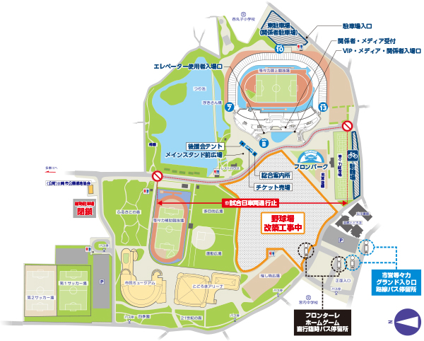 ホームゲーム開催時には多くの方が自転車でご来場されます。フロンパークをはじめとする競技場周辺は大変混雑しており、自転車に乗って通行されますと大変危険です。競技場周辺では、自転車を押して歩いてご通行ください。駐輪は等々力緑地内テニスコート横の常設駐輪場をご利用ください。