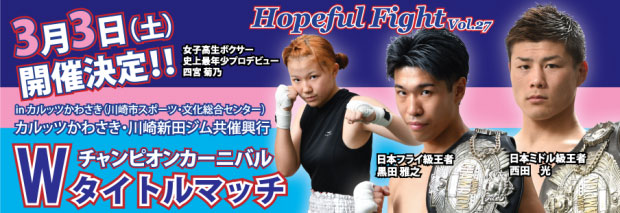 2018年3月3日(土)に川崎新田ボクシングジムが2016年3月以来となる、川崎市内での自主興行を開催します。開催場所は川崎フロンターレが新体制発表会見を行った、川崎区の新施設「カルッツかわさき」です。当興行ではチャンピオンカーニバルとして、川崎新田ボクシングジム2枚看板である、日本フライ級チャンピオン黒田雅之選手と日本ミドル級チャンピオン西田光選手によるWタイトルマッチが行われます!