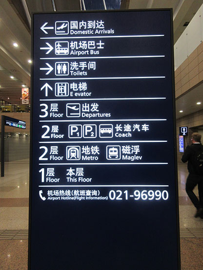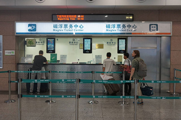 券売所で切符を購入。「龍陽路(Longhui Road)」まで7〜8分(時間帯により最高時速が異なる)、料金は片道50元(当日の航空券所持で片道40元)、往復80元、15分おきに運行。「龍陽路」からはタクシーがおすすめ。