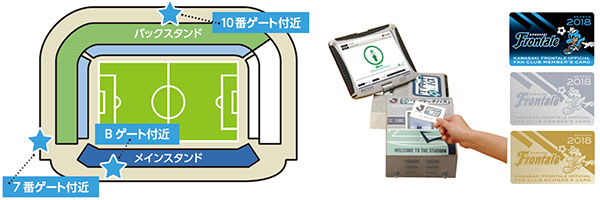 川崎フロンターレでは「ワンタッチパス」(Jリーグ全試合対象観戦記録システム)を採用しており、各入場ゲートに設置している「ワンタッチパス」端末に2018後援会会員証をタッチすると、後援会ポイントが付与されます。
