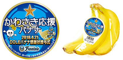 また、川崎フロンターレでは「DOLEバナナ感謝状授与式」を記念して「かわさき応援バナナ」の限定シールを作成いたします。4/21(土)鹿島戦にて行われるかわさき応援バナナ販売にて当シールを採用いたします。ついに勝ち取った星印と「DOLEバナナ感謝状授与記念」として、この日限定のシールデザインとなっています。是非ともフロンパークにてお買い求めください!