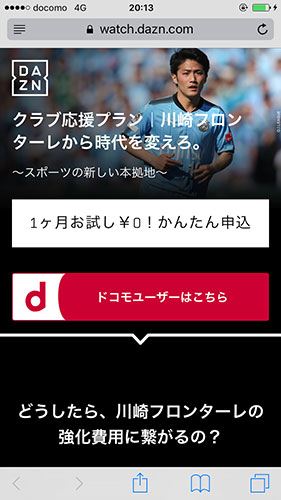 | 登録方法 | ◇下記URLにアクセスし、「1ヶ月お試し\0かんたん申し込み」ボタンよりご登録ください。下記以外のDAZNページより加入した場合はキャンペーンの対象にはなりませんのでご注意ください。