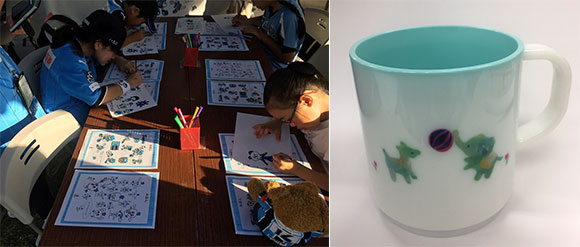 自分で自由に描いた絵をその場でマグカップにプリントして、世界にひとつだけのマグカップとしてお持ち帰りいただけます。空きペットボトルを原料にして作られた再生マグカップなので、とてもエコですよ!!オリジナルマグカップで、エコな生活を楽しみましょう!!
