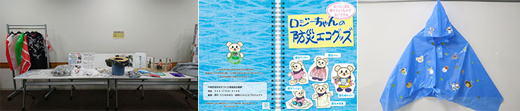 | 内容 | 中原区市民提案型事業で作成した冊子「ロジーちゃんの防災エコグッズ」。その実践編として、身の回りのもので、災害時やサッカー観戦時に役立つレインポンチョづくりを行います。 |