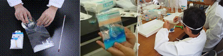 | 内容 | 数年前から「瞬間冷却材」が、省エネ、地球温暖化、また熱中症の対策として注目されて、夏場になるとお店にたくさんの商品が並ぶようになりました。実はこの「瞬間冷却材」は化学反応を利用した商品です。 ※作った瞬間冷え冷えパックはお土産にお持ち帰りすることもできます。 |