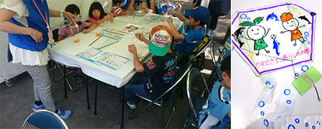 | 内容 | ◆マイバッグづくり A4サイズの布性無地のバッグにスタンプや布用ペイントで自由に描いてもらい自分専用のマイバッグをつくります。マイバッグ作りを始める前に簡単なクイズをしてレジ袋からマイバッグ買い物への啓発を行い、マイバッグと温暖化防止のつながりをレクチャーします。 |