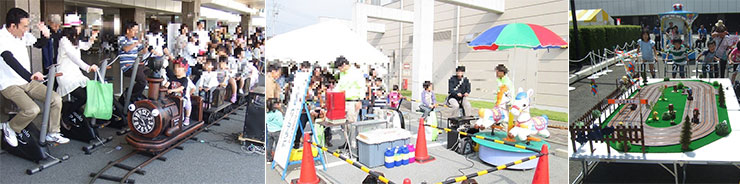 | 内容 | 人力発電で動くミニ電車やメリーゴーランドなどに乗って、「電気の大切さ」を体感してみよう! エコ電車:エアロバイク5台、電車4名のり メリーゴーランド:エアロバイク2台、メリーゴーランド2名のり スロットカーレース4台 ※台数等は変更の可能性があります。 |