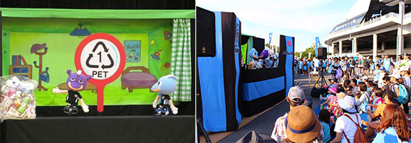 川崎フロンターレのキャラクターふろん太とワルンタが登場するごみ分別人形劇を上演します。