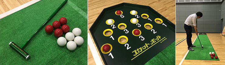 | 内容 | パターゴルフのように赤と白の球を的に向かって打ち込んでいきます!チャンスは一人5球。得点に応じて景品を差し上げます! |