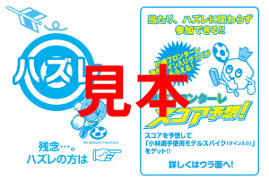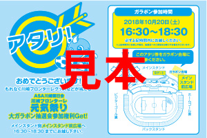 | 賞品引き換え | 試合終了30分間後まで、メインスタンド前広場特設テントにてお渡しします。 (特設テントは、試合開始まで席ツメ隊のテントがあるあたりに設置予定です。) |