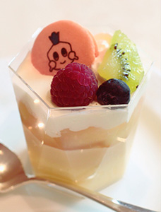 糖度の高い米崎りんごを陸前高田の銘酒酔仙に漬けて柔らかくコンポートしたりんご、キャラメルのムース、プリンで3層に仕上げたプリンアラモード。上に飾ったカブレラマカロンにはリンゴジャムが入っています。素材の糖度の高さを生かしできるだけ砂糖を使わずヘルシーに。りんごの甘さとキャラメルのほろ苦さを楽しめるプリンです。