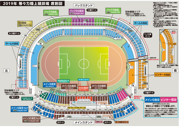 ※「ピッチサイドシート」を除くメインスタンドの全席と、バックスタンド・両ゴール裏の2階席は屋根に覆われています。ただし風向きや雨の強弱によっては雨に濡れる場合があります。
