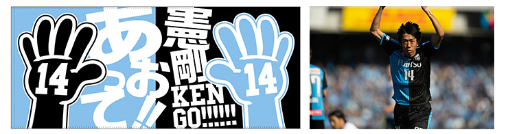試合中に見られるサポーターへの煽り。その名の通り「憲剛煽って!!」と大きく書かれたフェイスタオルがあればより頻度も多くなるはず…。本人のご要望!?にお答えし、再入荷が決定いたしました!