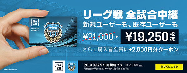 | その他ご注意 | ◇現在Jリーグオンラインストアでの販売予定はありません。変更がありましたら改めてお知らせします。 ◇過去にDAZN年間視聴パス/ハーフシーズン視聴パスをご購入・利用頂いている方もこちらへ引継ぎいただく事が可能です。 ◇2,000円割引クーポンは等々力陸上競技場売店、イトーヨーカドー武蔵小杉駅前店、東急ハンズ川崎ダイス店は使用不可となります。 ◇年間視聴パスのカードは捨てずにお手元において置いてください。今後良いことがあるかもしれません…。 |