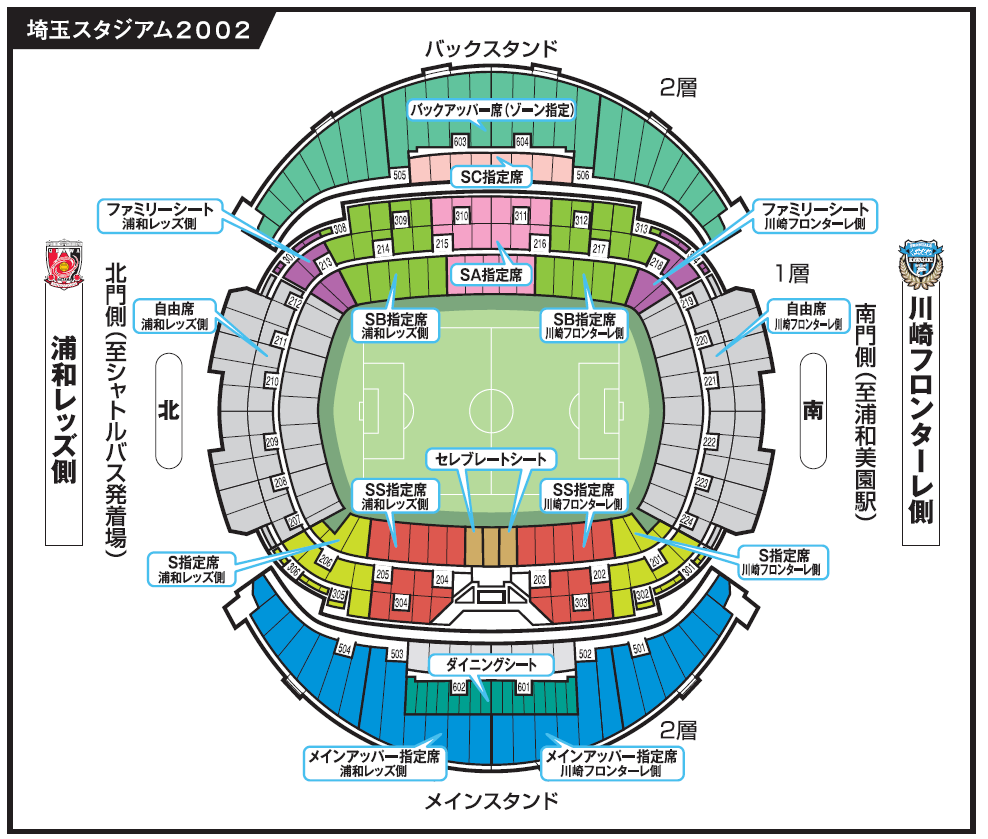 ●SS指定席、S指定席、SB指定席、メインアッパー指定席、ファミリーシート、ドリームチケット、自由席は購入時に浦和側/川崎側の指定ができます。