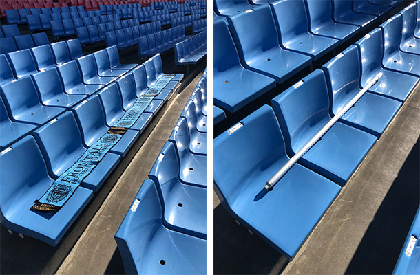 2018シーズンは、過剰な席取り、主にシーズンチケット開門直後の席取りについて会場スタッフを増員し、試合毎にエリアを決め、重点的に対応を行いましたが、下記写真のような過剰な席取りが多く見受けられました。今シーズンも引き続き、1人でも多くのファン・サポーターが座席で応援できるよう、ご自身の席のみの座席確保のご協力をよろしくお願いいたします。