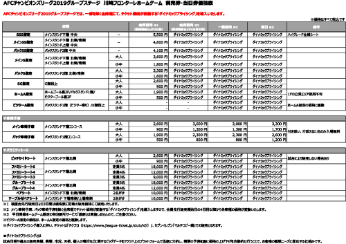 川崎フロンターレでは、AFCチャンピオンズリーグ2019の席割および入場料について、下記の通り決定しましたので、お知らせいたします。今シーズンより、AFCチャンピオンズリーグ2019ホームゲーム開催時には、「全席指定席」で運営いたします。観戦マナー&ルール、応援ゾーン、入場方法等はリーグ戦と異なりますのでご注意ください。また、グループステージ3試合にて、一部を除く全席種でチケット価格が変動する「ダイナミックプライシング」を導入いたします。