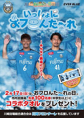 川崎フロンターレが地域貢献活動の一環として2010年にスタートした川崎市内銭湯の利用促進キャンペーン『いっしょにおフロんた〜れ』。今年は2月17日(日)が「お風呂の日」=「おフロんた〜れの日」です。当日は、川崎浴場組合連合会と川崎フロンターレのコラボタオルをプレゼントいたします。銭湯の楽しさをより多くの方に知っていただくと共に、川崎浴場組合連合会とホームタウン川崎を盛り上げます。