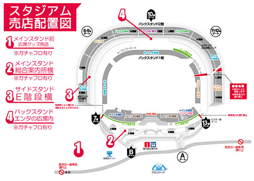 | 設置場所 | ◆場外メインスタンド前広場グッズ売店横「ガチャ村」 ◆場内メインスタンド総合案内所横グッズ売店付近 ◆場内バックスタンド「エンタの広場グッズ売店」 |