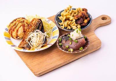 | コース価格 | 陸前高田のおつまみ盛り合わせ+ドリンク飲み放題付き 3,500円(税込) 陸前高田のおつまみ盛り合わせ+1ドリンク付き 2,000円(税込) |