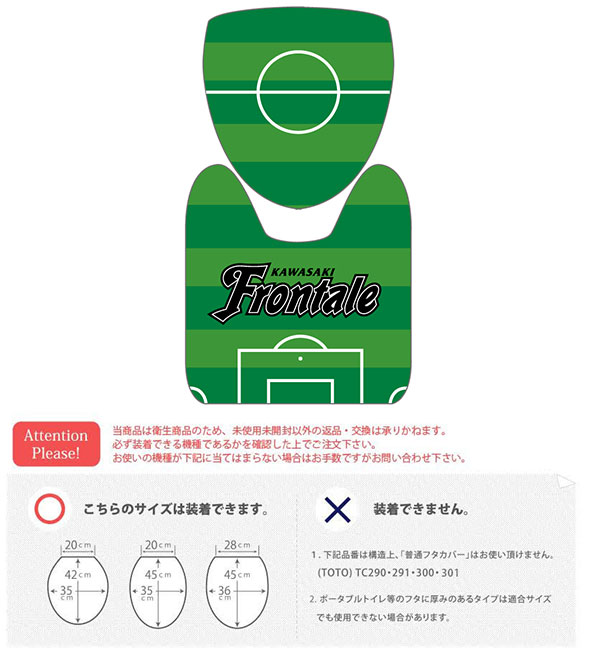 トイレフタカバーとトイレマットの2点セット。デザインはサッカーファンには嬉しいピッチを表現したグリーンのストライプとペナルティエリアやセンターサークルの白線、さらにフロンターレロゴを。