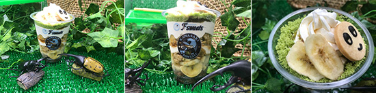 | 企画⑫ | ◆黄金の密が輝く昆虫スイーツ!じゅえきバナナパフェ販売! 皆さんカブトムシの大好物がバナナってご存知でしょうか!?カブトムシを捕まえる際にもトラップとして活用されるバナナを使った昆虫グルメがカブトムシの森に初登場!!本物の樹液を使った「じゅえきバナナパフェ」を販売します!ボリューム満点で激ウマスイーツをお楽しみください!