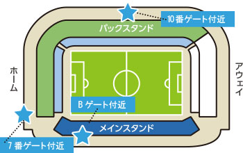 Bゲート階段上、7番ゲート付近、10番ゲート付近に設置いたします。(ビジターサポーター向けには、13番ゲート付近に設置しております。)