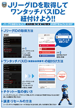 | 「JリーグIDの取得」と「JリーグIDとワンタッチパスID(後援会会員番号)との紐づけ」を実施することにより、譲渡、リセール、チケット一覧サービスを利用できるようになります。 ※チケット一覧とは、シーズンチケットやJリーグチケットで購入したチケットをまとめて管理できるサービスです。 |