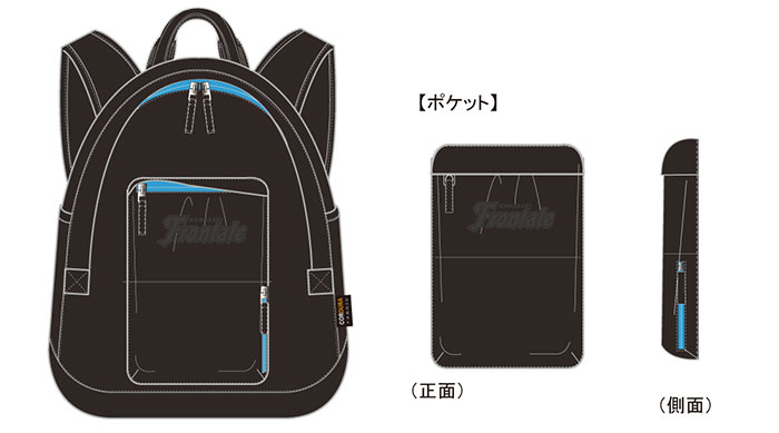 メインビジュアルは普段使いしやすいブラックに。中生地にはフロンターレブルーを使用しているのでさりげなくフロンターレアピールを!バッグをコンパクトに畳むことが出来るのでお土産など購入した物を入れるセカンドバッグとしてもオススメ。