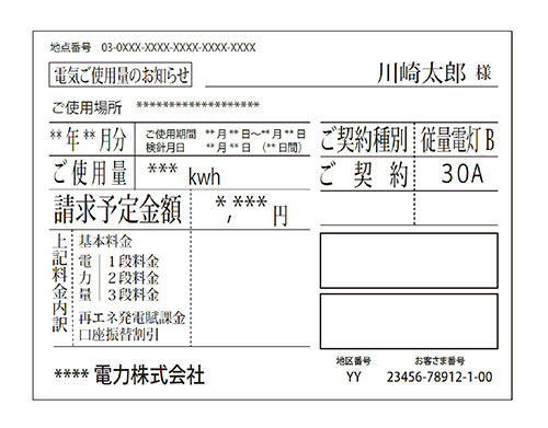 フロンターレでんきの料金シミュレーションおよびお申込みは、以下のQRコードから行えます。まずは検針票(右図)をご用意ください!