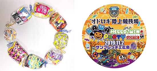 みんなで仮装してお菓子をゲットしよう! 「ファイト!川崎フロンターレ」のMC高階亜理沙さん、「SukiSukiフロンターレ」でお馴染みの阿井莉沙さんや目印となるアイテムを仮装しているスタッフに「トリックオアトリート!」と伝えると、仮装をした人達にロッテのハロウィンお菓子をプレゼント!オドロキ競技場内・外各所で見つけて、たくさんお菓子をゲットしよう!