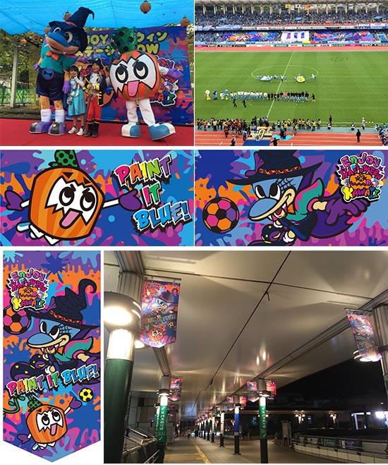 原宿KAWAII文化の第一人者で、アートディレクターの「増田セバスチャン」さんがデザインしたハロウィンビッグフラッグ&タペストリーが、川崎の街中に出現します。また、試合当日はふろん太とカブレラもこのハロウィン衣装を着用しますよ!