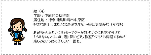 架空のファミリーですが4人家族のキャラクターを作成し、試合だけでなく、イベントやスポンサー様のイベントなどフロンターレサポファミリーあるあるの視点でツイートしていきますので、共感いただければリツイートして、フロンターレサポーター以外のご友人やお知り合いにフロンターレサポである事の楽しさを拡散するお手伝いをしていただければと思います。あわせて、寄せられる・交わされるご意見を今後のあらゆる企画の参考としていきたいと思っています。まずは、ぜひフォローをお願いします。