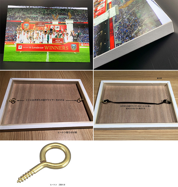 角材を使用したパネルのため丈夫かつ自然な色合いの素材のためお部屋の色味にマッチするインテリアグッズとしても人気。また簡単に取り扱いや展示が可能です。付属のヒートンにお持ちの紐やワイヤーを通して紐掛けで展示をしたり、ダルマピン(2個)やL字フック(2個)は紐がなくてもパネルが直接かけられます。
