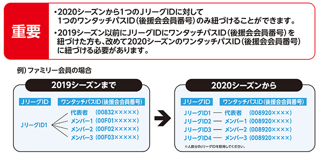 2019年にJリーグIDとワンタッチパスID(後援会会員番号)を紐づけた方も、改めてワンタッチパスID (2020シーズン後援会会員番号)を紐づけることが必要です。