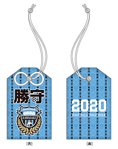 「新体制発表会見」当日の定番グッズ“勝守”。デザインは2020シーズンユニフォームをモチーフとし、フロンターレの勝利を願うだけでなく、受験シーズンのお守りに使う人もいる願掛けグッズ。