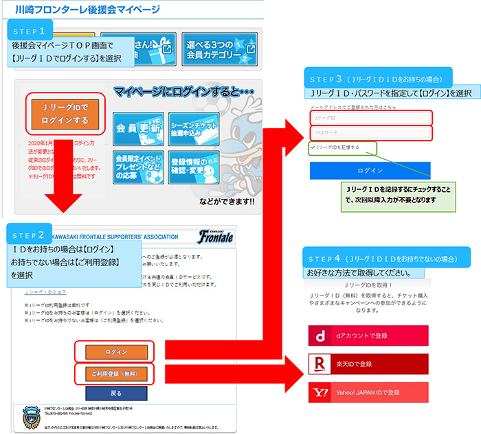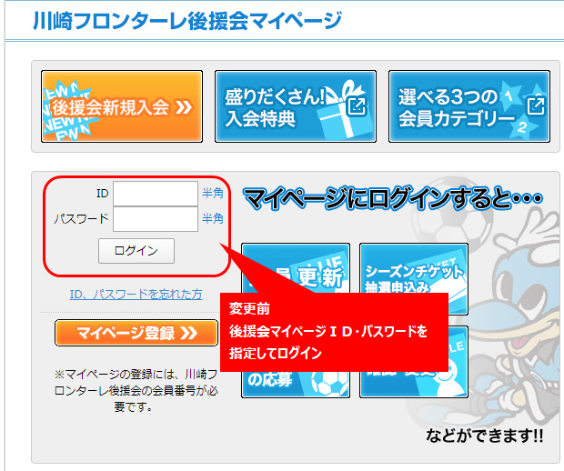 川崎フロンターレでは、2020年1月23日(木)13:00より後援会マイページでのログイン方法の変更および、入会方法の変更をしますので、お知らせいたします。後援会の会員情報とJリーグIDの会員情報が連携されることにより、JリーグID 1つで、情報の管理ができるようになります。