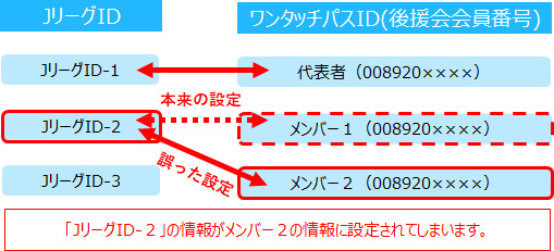 JリーグIDとワンタッチパスID(後援会会員番号)を紐づける際、ワンタッチパスID(後援会会員番号)の選択(紐づけ)にご注意ください。下記の通り、誤った設定をした場合、情報が上書きされます。