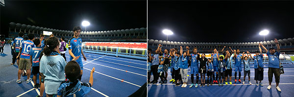 川崎フロンターレが勝利時、試合直後にピッチ横トラック上にて、選手とハイタッチをし、共に万歳三唱をします。