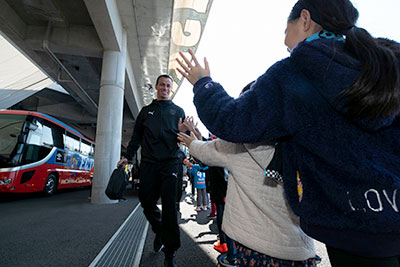 選手バスでスタジアム入りする選手たちを子どもたちがハイタッチで迎えます。