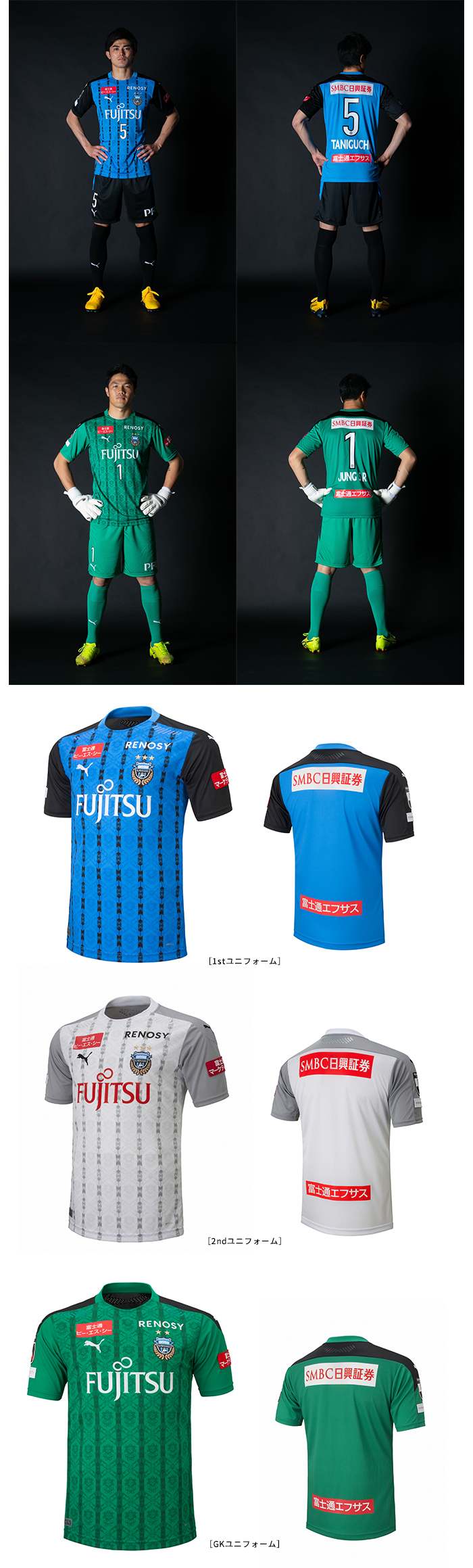 2020年の川崎フロンターレ1stユニフォームは、PUMAのグローバルデザインコンセプト“CRAFTED FROM CULTURE”に基づきホームタウンのカルチャーからインスピレーションを受けたデザイン。必勝祈願を行うホームタウン川崎を象徴する寺社からインスピレーションを受け、伝統的な川崎ブルーに縦のストライプと幾何学的にパターン化された飾り金具を模したデザインが施されています。