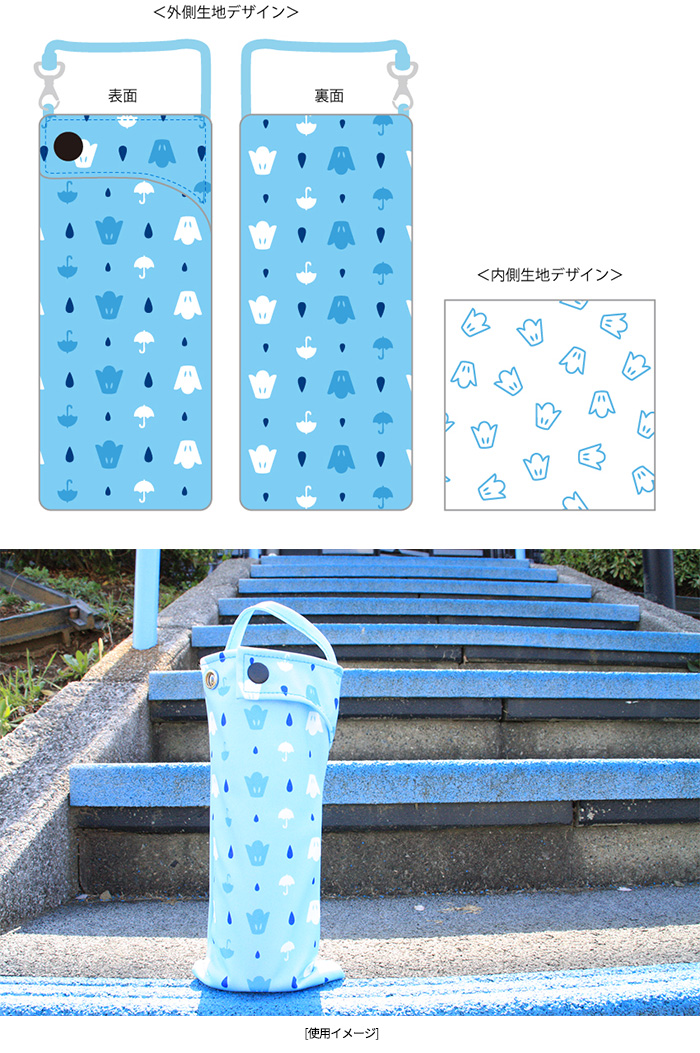 口が大きく開くので出し入れしやすく、内側が吸水生地になっているので濡れたままの折り畳み傘やペットボトルなども収納できます!持ち手にはフックタイプの金具付きでバッグに引っ掛けられるので便利。